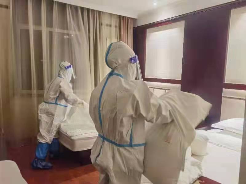 閉環(huán)服務(wù)期間,客房部員工面對(duì)疫情不畏懼不退縮,不計(jì)較個(gè)人得失,甚至有的同志帶病工作,卻仍然義無反顧堅(jiān)守崗位,累計(jì)閉環(huán)54天。11月10日,入住西樓的84名醫(yī)護(hù)人員臨時(shí)通知撤離,由甘肅省人民醫(yī)院緊急抽調(diào)的101名醫(yī)護(hù)人員入住換防。當(dāng)時(shí)飯店其他員工都在居家辦公,客房部18位輪休人員第一時(shí)間主動(dòng)請(qǐng)纓,努力說服家人,自主到社區(qū)辦理通行證后趕到飯店,投入緊張的客房和公共區(qū)域衛(wèi)生清掃與消殺工作,直到凌晨2點(diǎn)。在這個(gè)特殊的時(shí)刻,飯店客房部員工筑起了牢固的防疫堡壘,堅(jiān)守著這個(gè)特殊的“戰(zhàn)場(chǎng)”,他們的默默奉獻(xiàn)與守護(hù)也成為了醫(yī)護(hù)人員眼中最可愛的“逆行者”。