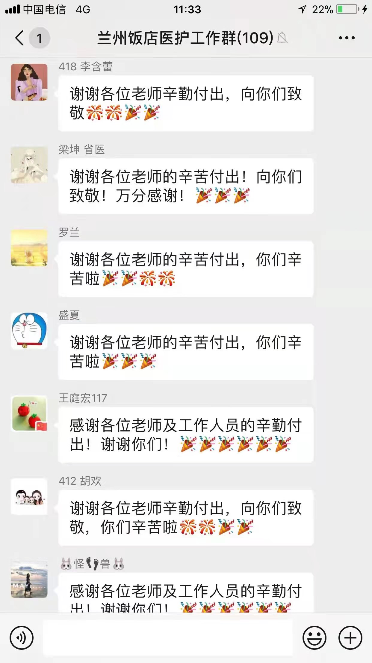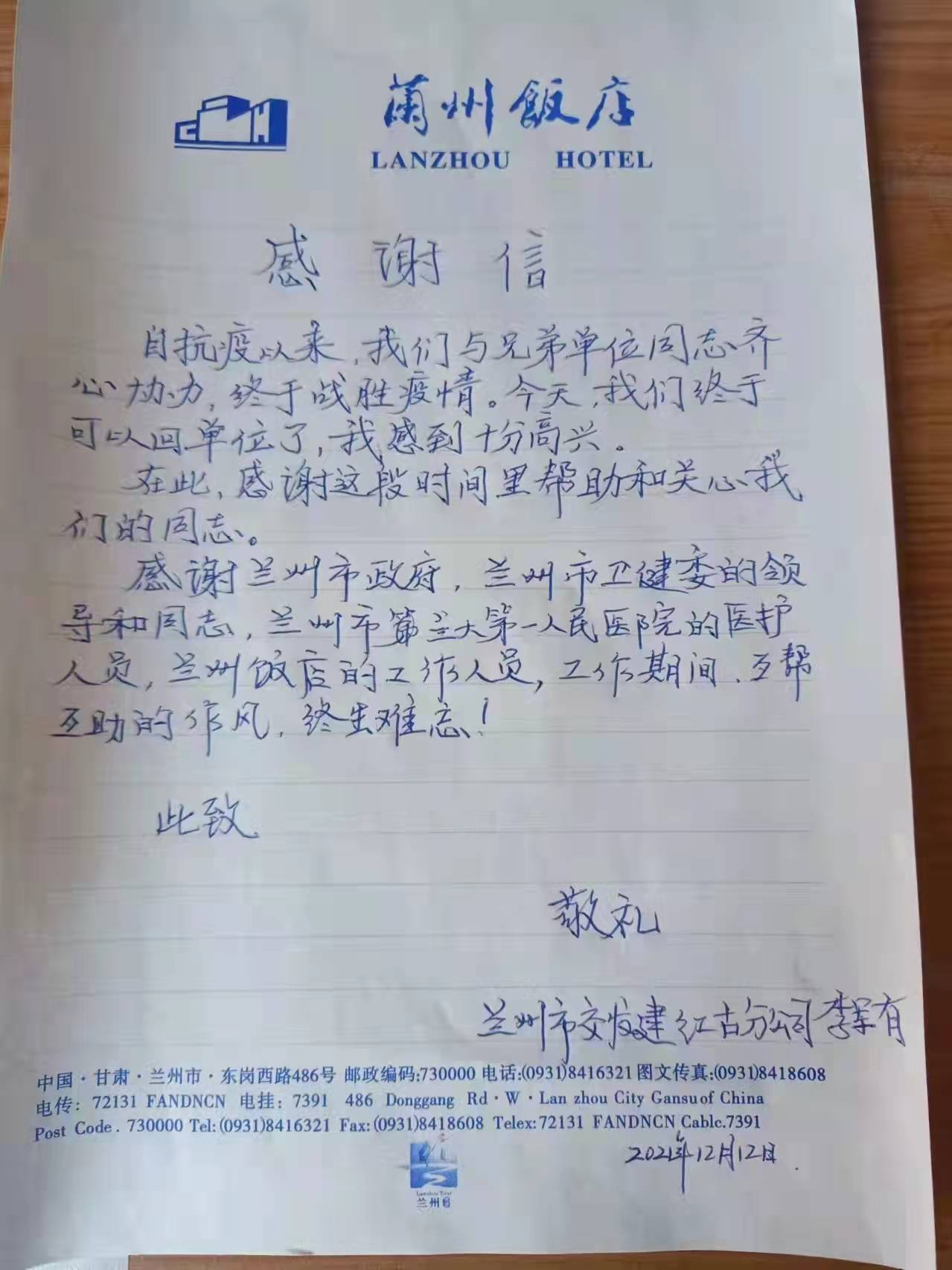 抗擊新冠肺炎疫情,事關(guān)大局,關(guān)乎每個(gè)人的生命安全與身體健康。疫情發(fā)生后,飯店領(lǐng)導(dǎo)和所有黨員干部主動(dòng)擔(dān)當(dāng)、敢于作為,堅(jiān)持工作在一線,體現(xiàn)了飯店的社會(huì)責(zé)任,為疫情防控積極奉獻(xiàn)力量。隔離結(jié)束后,醫(yī)護(hù)人員們通過感謝信、微信和電話等方式,由衷感謝蘭州飯店服務(wù)人員的暖心陪伴和貼心服務(wù)。