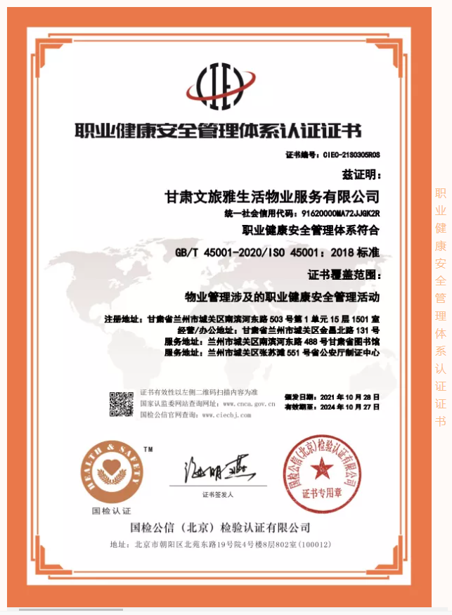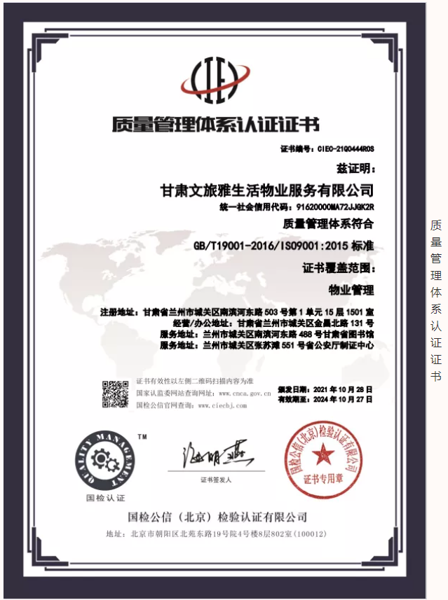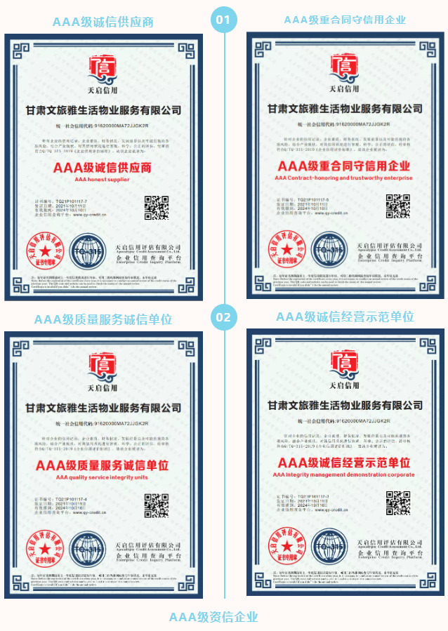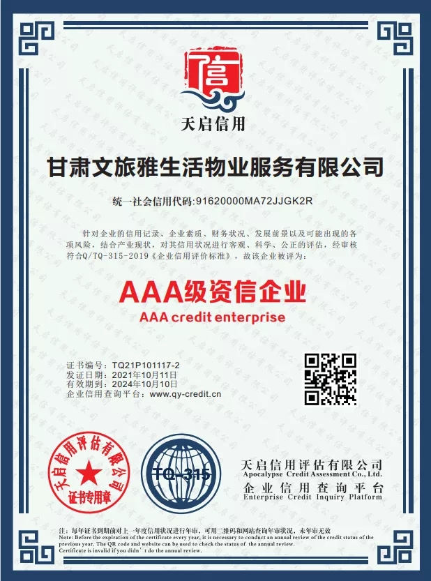 2021年,甘肅文旅雅生活物業(yè)服務有限公司認真貫徹落實習近平新時代中國特色社會主義思想,堅決落實集團公司各項決策部署。按照集團公司高質量發(fā)展要求,結合自身發(fā)展需要,公司于9月份正式啟動3A體系認證工作,經過權威認證機構對公司信用管理、制度建設、管理體系等方面綜合評估,10月底公司順利通過3A體系認證,使得公司在管理水平、制度建設方面有了進一步完善及提升,增強了公司核心競爭力和品牌影響力,為公司高質量發(fā)展奠定了堅實的基礎。